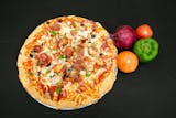 Pepperoni, sweet Italian sausage, green peppers, onions, black olives, sauteed mushrooms, red onions & tomatoes
